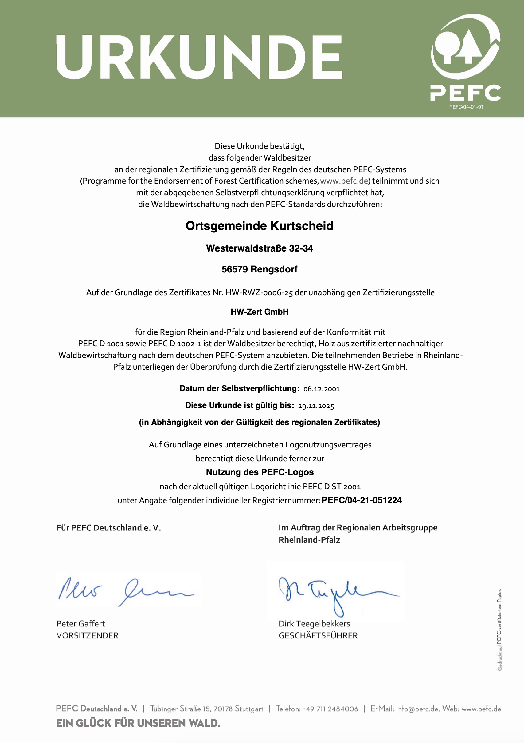 Auf der Grundlage des Zertifikates Nr. HW-RWZ-0006-25 der unabhängigen Zertifizierungsstelle HW-Zert GmbH für die Region Rheinland-Pfalz und basierend auf der Konformität mit PEFC D 1001 sowie PEFC D 1002-1 ist der Waldbesitzer berechtigt, Holz aus zertifizierter nachhaltiger Waldbewirtschaftung nach dem deutschen PEFC-System anzubieten. Die teilnehmenden Betriebe in Rheinland-Pfalz unterliegen der Überprüfung durch die Zertifizierungsstelle HW-Zert GmbH. Datum der Selbstverpflichtung: 06.12.2001. Diese Urkunde ist gültig bis: 29.11.2025 (in Abhängigkeit von der Gültigkeit des regionalen Zertifikates)